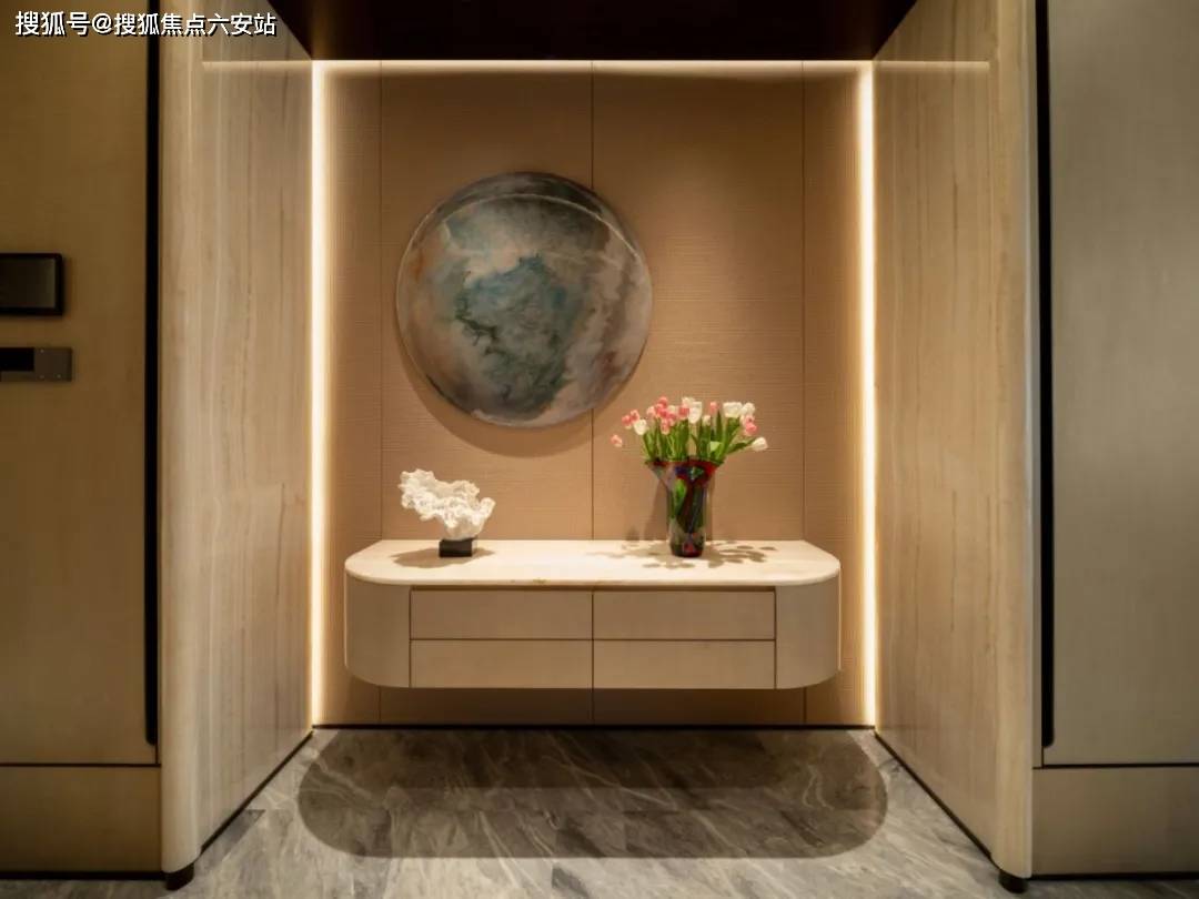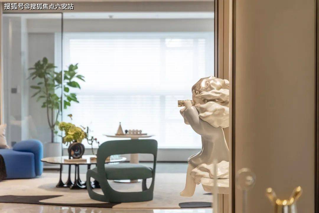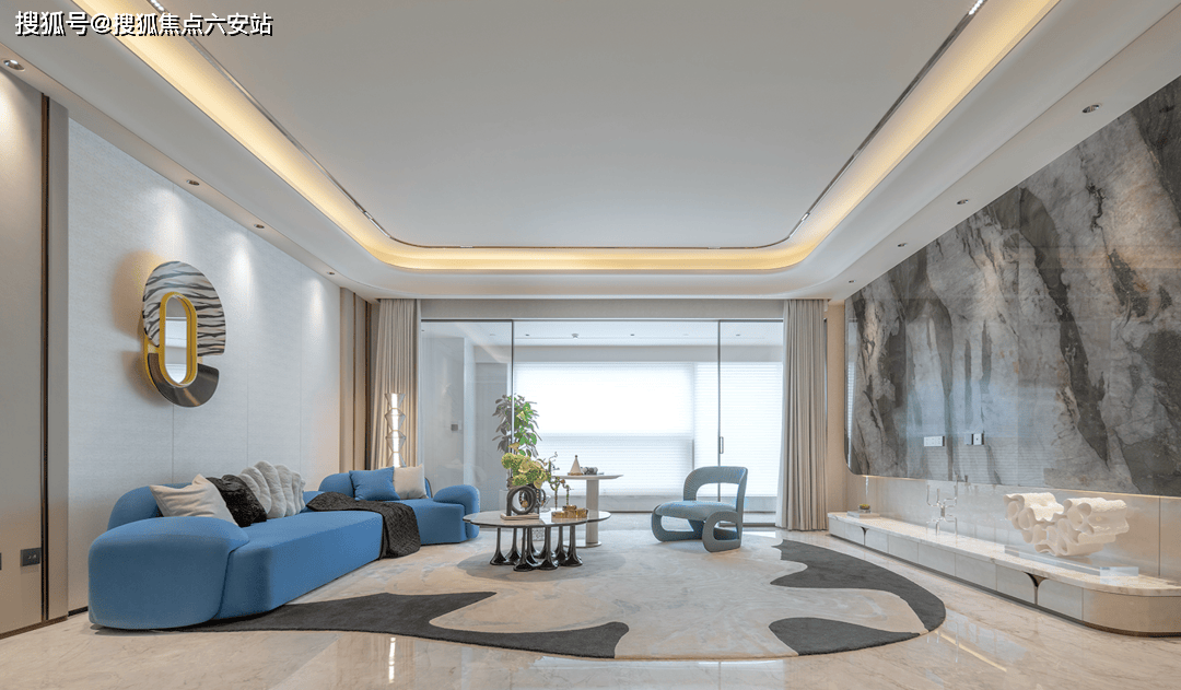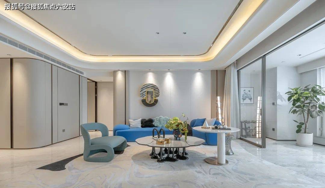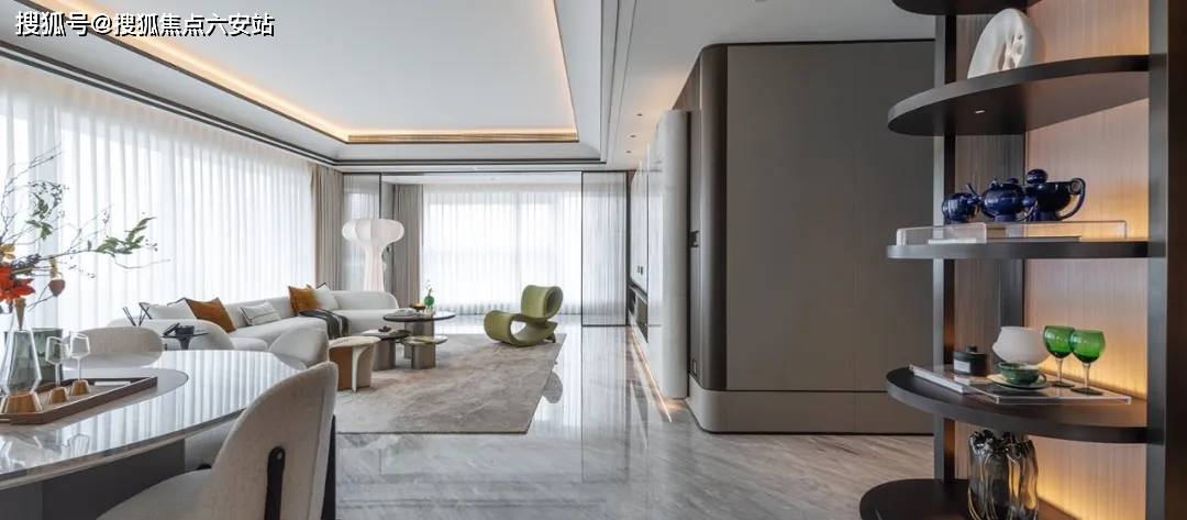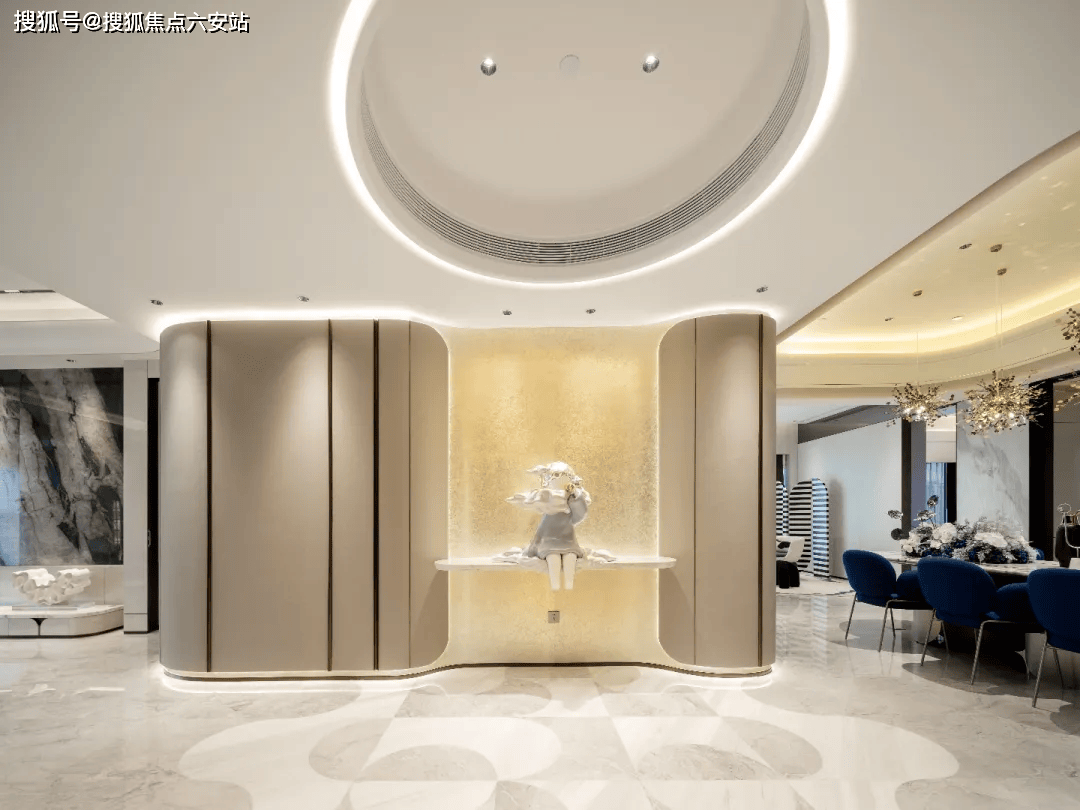 项目由GAD建筑设计院、邱德光、琚宾三大顶流团队联袂打造,融合ART DECO经典美学与现代NEO艺术。外立面采用香槟金铝板与LOW-E玻璃幕墙,几何线条呼应钱塘江潮涌;蓝眼睛石材悬挑雨棚、拱门连廊等设计,将《了不起的盖茨比》的摩登气质植入归家动线㎡观景露台,LDK一体化公区达100㎡,6.15米超大客厅背景墙采用百达翡丽奢石,搭配芬迪白台面,实现“引景入室”的IMAX级视觉震撼。