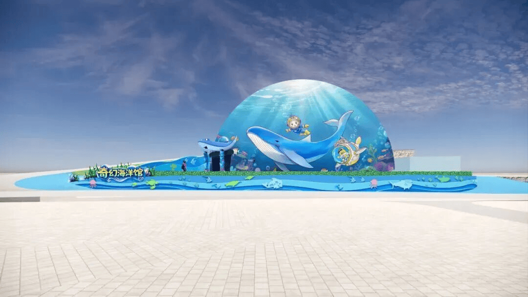 奇幻海洋馆占地超1400㎡,单场容客超200人,超220㎡高清画面搭配360°全景音响,影院彩绘结合芒果 IP 打造奇幻深海主题,游客可360°沉浸式感受 “孙悟空大闹东海龙宫”。