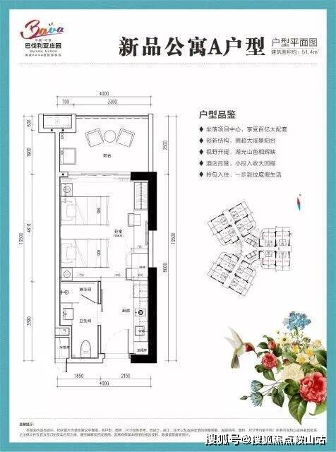 A户型:稀缺旅居产品,建面约58㎡,一房一厅一卫,干湿分离,L型超大阳台,尽享湖光山色;总价约70万起。