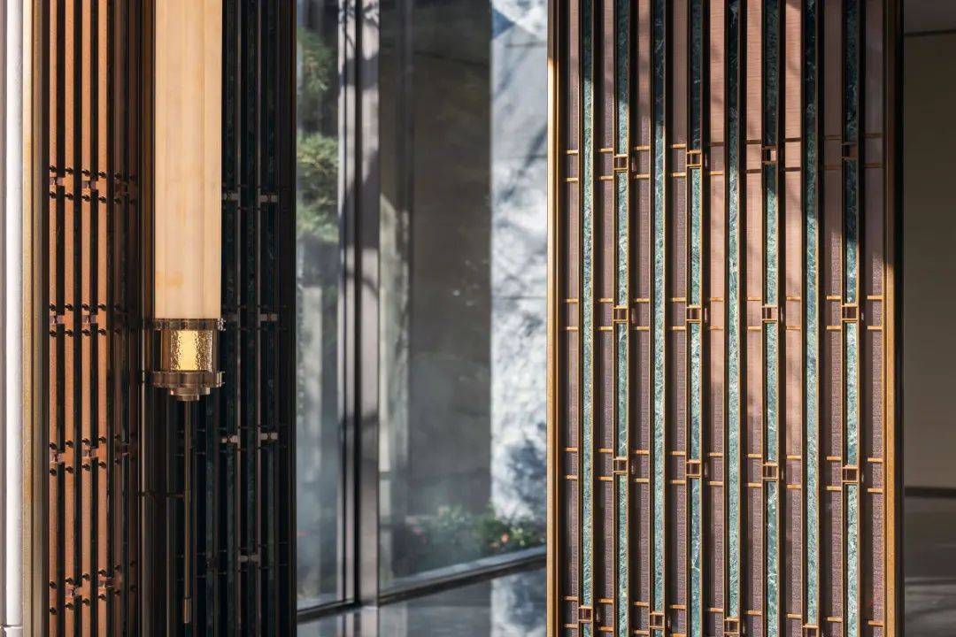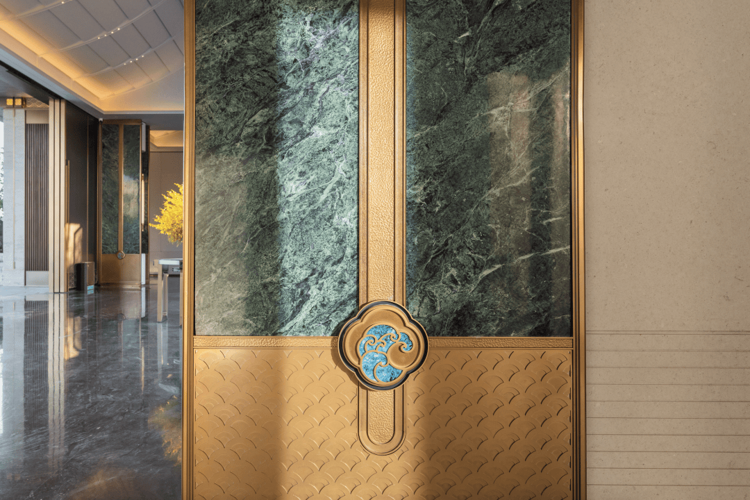抬眼可见「江南坡屋顶造型」,prada绿奢石做的屏风、“墨染”流云大理石、门楼挂画、叠水倒影吊顶、屏风宫灯……尽显中式风韵的大气和隐贵。
