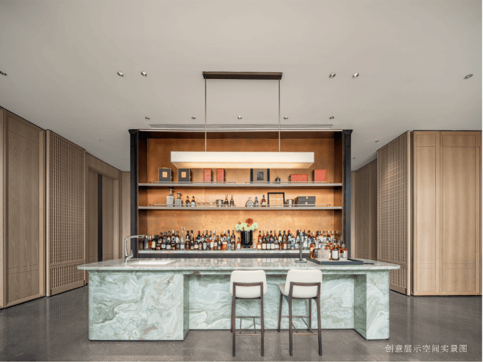走过流晖玉桥,经过上百吨原石铺陈的台阶,来到云启钱湾自带建面约2000方的全维下沉式会所“缘溪行馆”。
