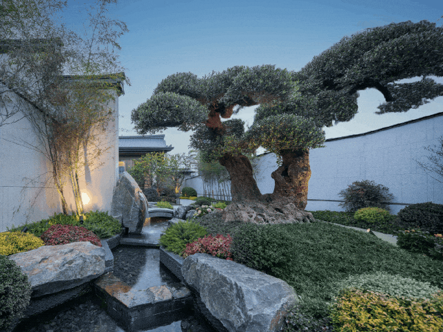 院中百年冬青挺拔常绿,似忠诚守护者彰显生命力,300年树龄的百年茶梅是项目组寻遍海内外所得,为“镇园之宝”,霜寒时冷艳绽放,被誉为“冬日花魁”,与镜水汀院相映,绘就山水画卷,尽显中式美学的含蓄、典雅与清幽,如桃源之境令人沉醉。