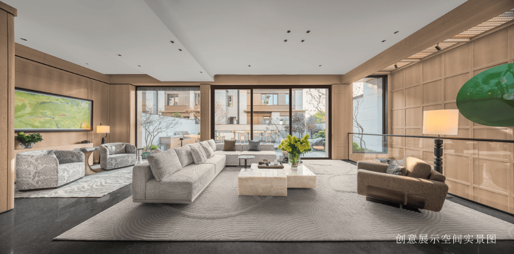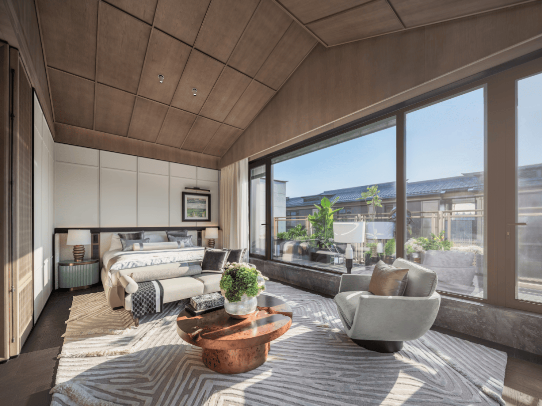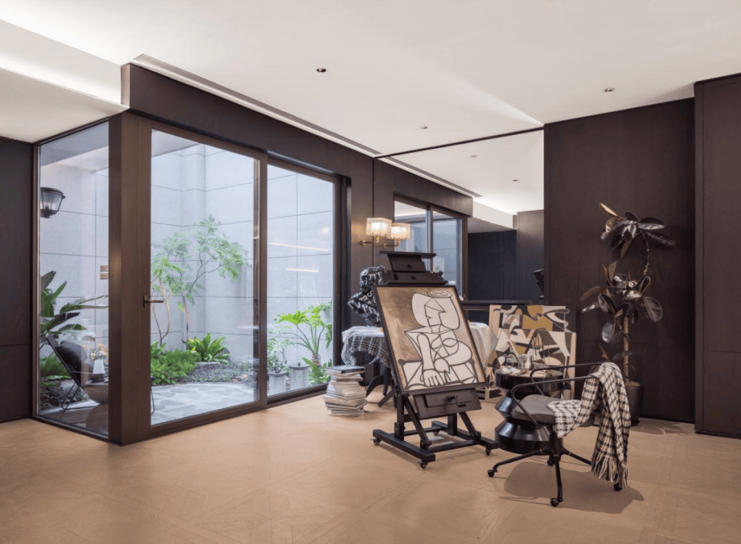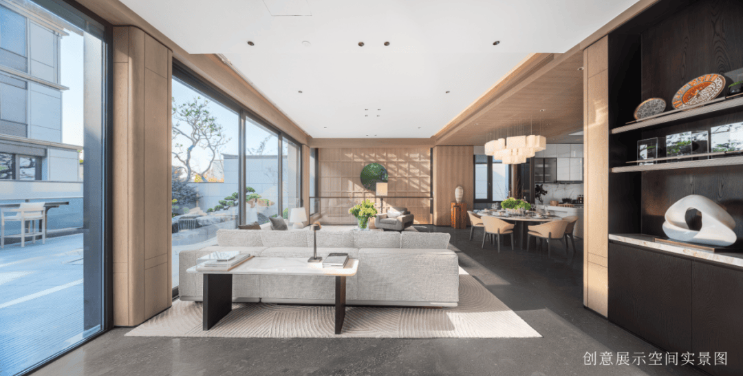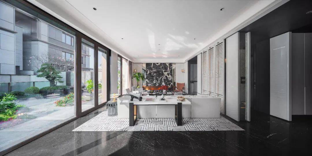登堂入室,一幅巨大的落地超白玻璃窗如同精致的画框,「框景」将二进庭院中极具层次感的羽毛枫、拱门和廊桥装进了这幅写意山水画中。