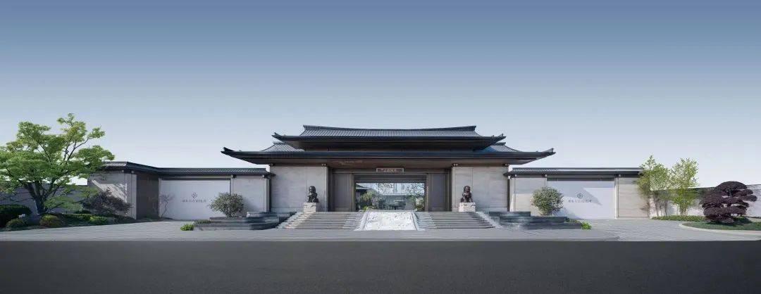 主入口是恢弘气派的入园大堂,采用仿传统屋顶戗脊形式「重檐悬山顶」,辅以九级台阶、水纹御道、威严铜狮的祥瑞、昌隆、拾级而上的美好寓意,用中国传统建筑的高贵形制,开启世家大宅的尊贵与显赫。