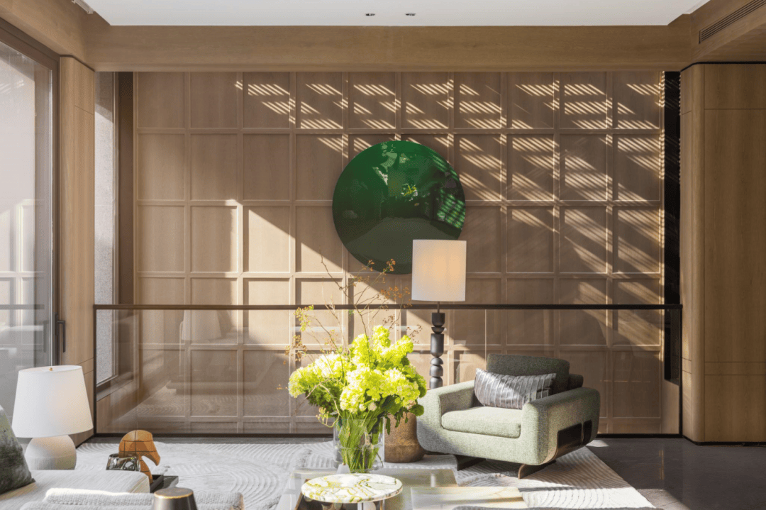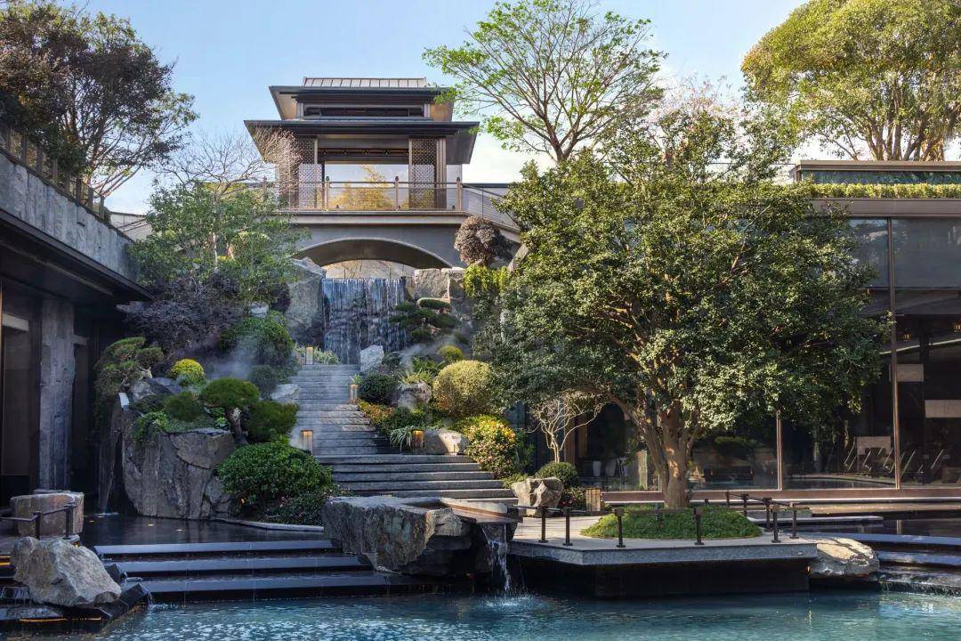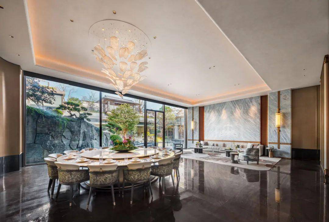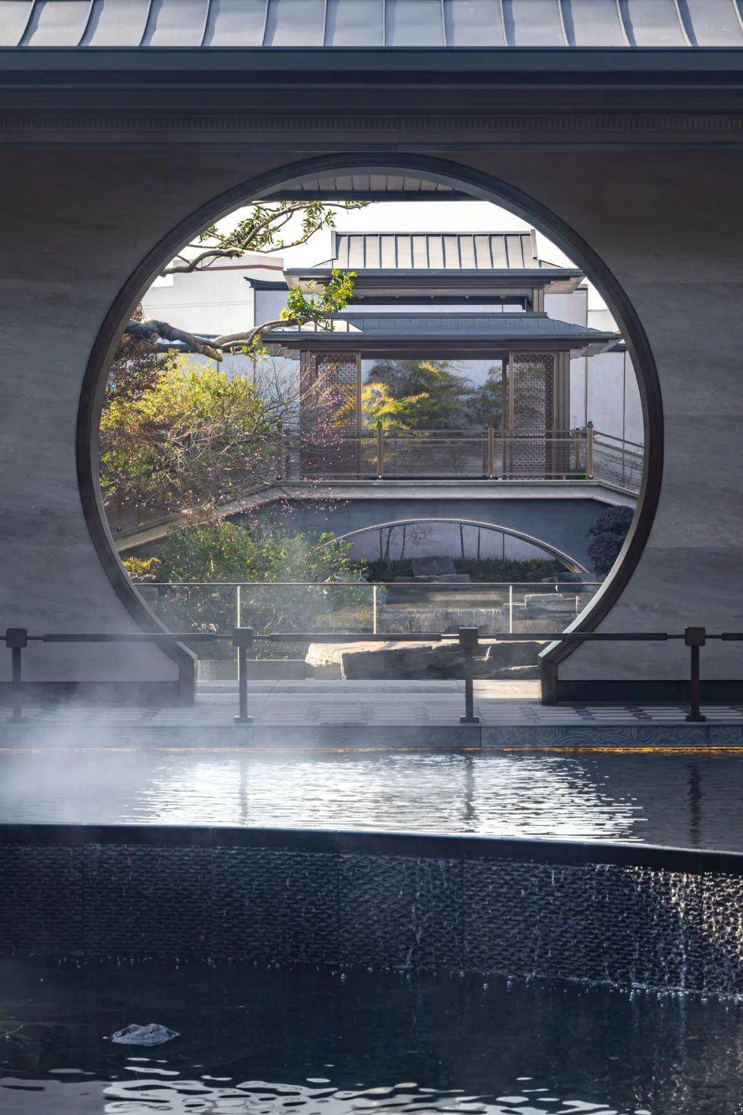 转身沿着曲折的连廊,缓缓穿过拱门之际,眼前便豁然开朗起来。这里的布局和流线,巧妙地再现了西湖郭庄的「一镜天开」,让人在现代的奢华中感受到古典园林的韵味。