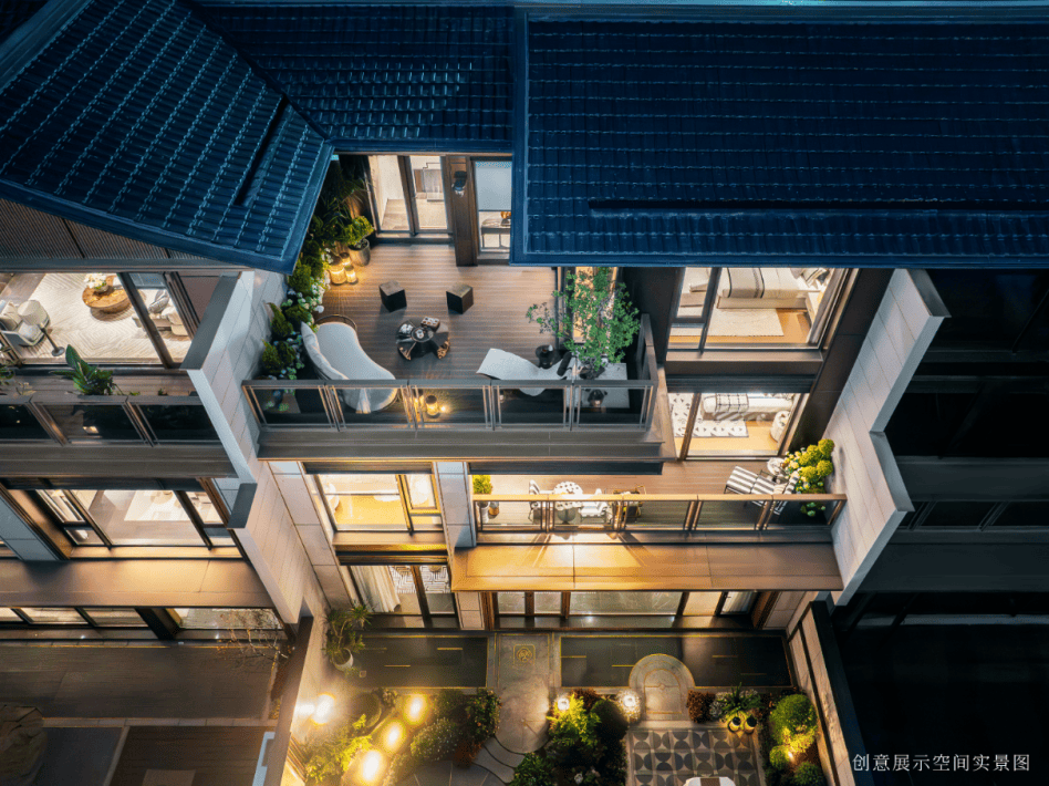由于室内较巷道抬高约1.5米,部分地下室层高可达约7.75米(局部房源),借此将光和风充分引入地下室,创新设计“光感”下沉式庭院;层层退台形制,让每一层都拥有空中露台或者阳台,扩大与自然的接触面,使每一层空间都能获得充足的日照与通风。