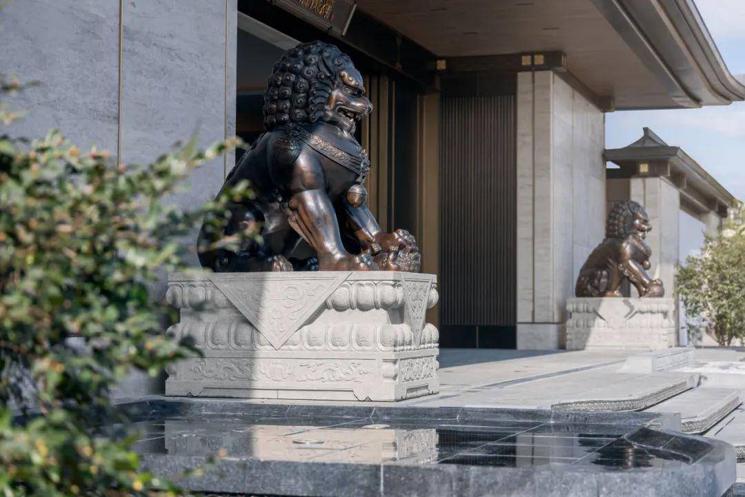 两侧「守门铜狮」采用黄铜锻造,重量超过600斤,北侧雄狮踩绣球,南侧雌狮抚幼狮,以及九级台阶进门礼序,尊贵感扑面而来。