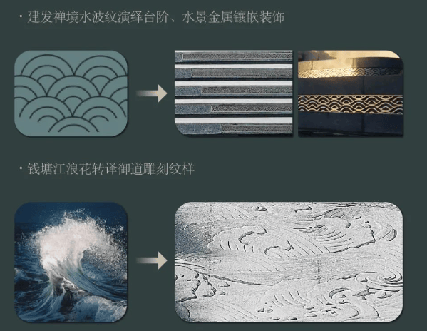 铺地的「立体水纹」,用当代简洁的线条,演绎钱塘江浪花涌动之形态,转译美好意象。