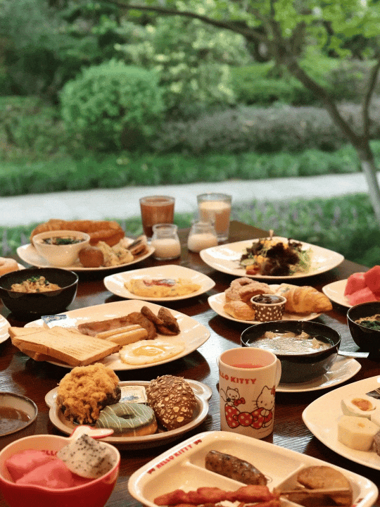 瑶园咖啡厅享用自助早餐。270度全景落地窗外,满眼盎然绿意与繁花。部分邻窗的坐席更可远眺西湖。