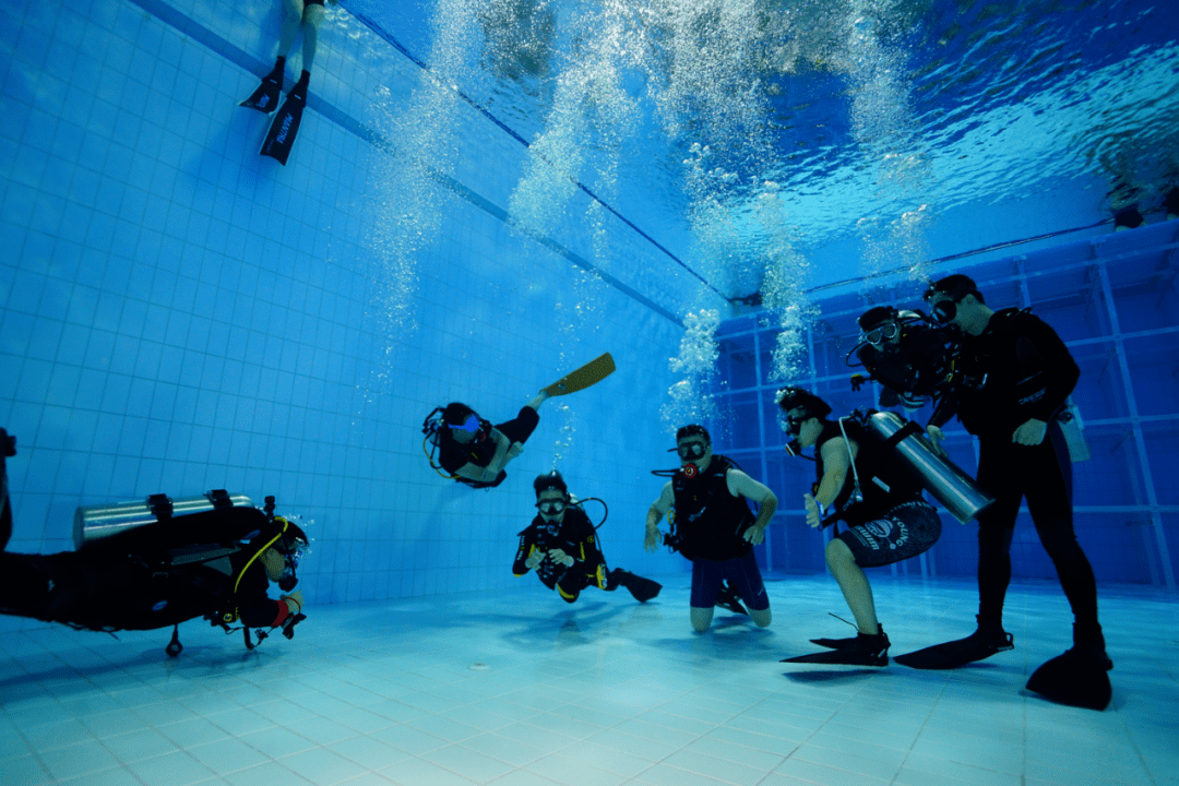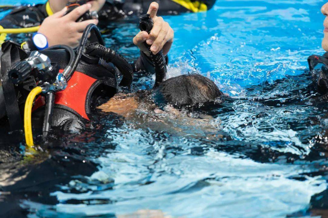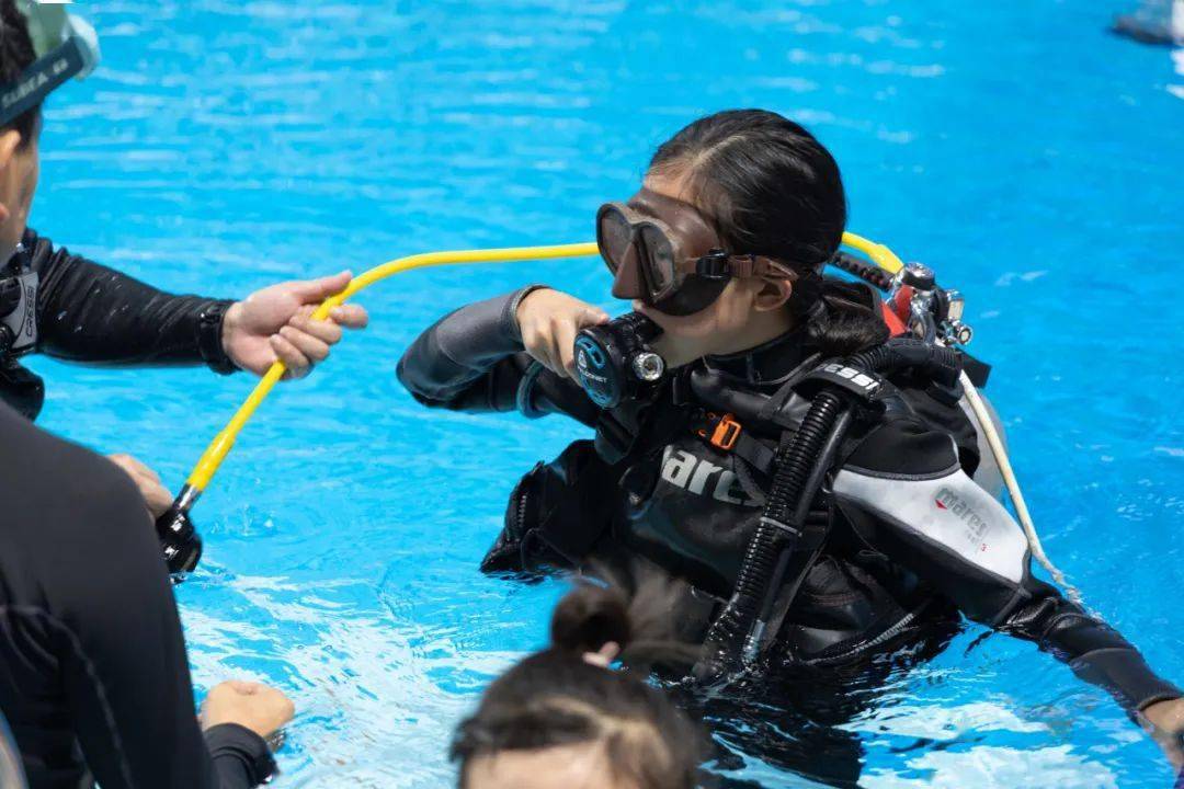 水池的另一端,渴望通过考取潜水资格证解锁更多潜水场景的成年学员在教练的指导下,独自完成了一次水底深潜,露出水面后,他向同伴兴奋地宣布:“我觉得我学会了!”这是他第二次练习潜水。