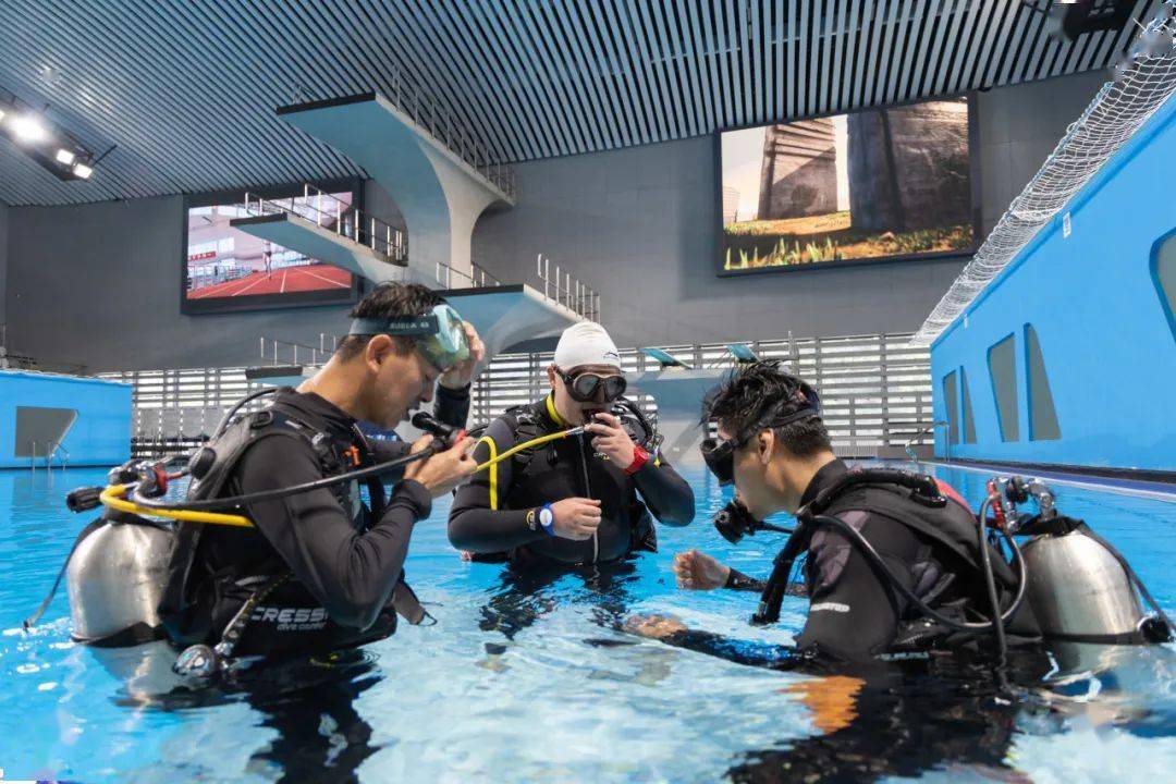 为体验者啧啧称道的还有其潜水的安全性,浙江黄龙体育中心游泳跳水馆配备齐全的安全设施和服务,岸上的救生员是专业潜水教练。教练认真负责的工作状态和专业能力让潜水者的安全感倍增。