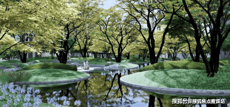 三园悦心·清溪,是园区内最大的水景洽谈休憩空间。结合绿化、地形,打造游赏、自然、休憩水景。