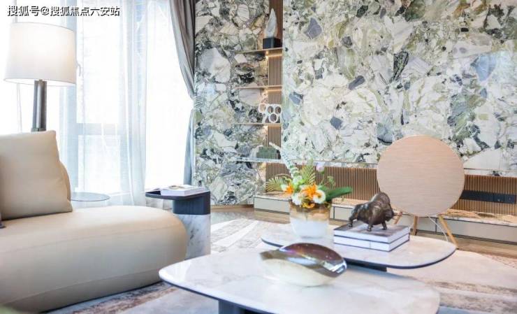 奢石的使用是紫金蘭轩样板房的一大亮点:与成都W酒店、深圳湾壹号同款的冷翡翠,出现在了客厅背景墙上。纹理形似流水绿荫的冷翡翠,呼应紫金蘭轩滨水环境的蓊郁与苍翠。