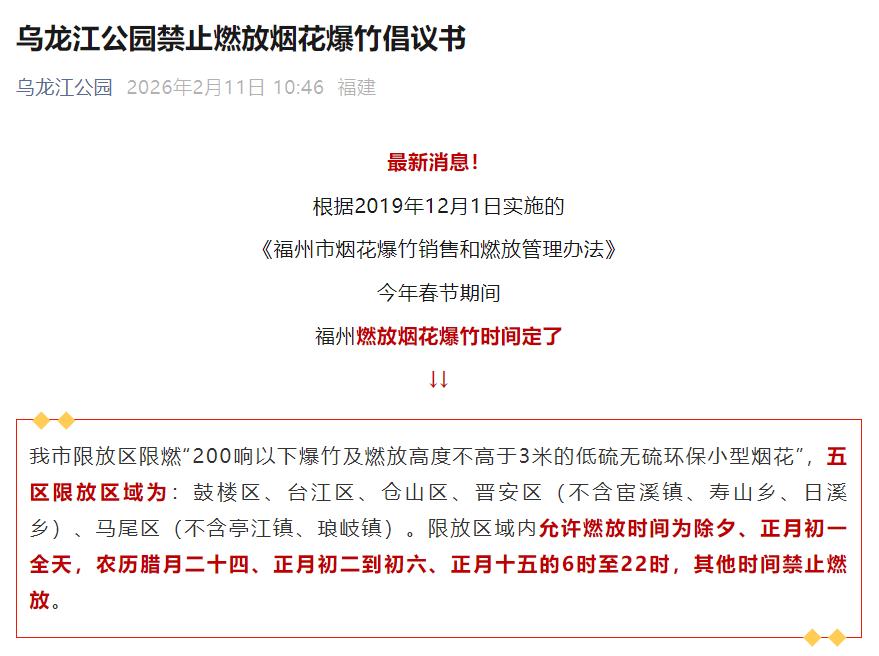 “乌龙江公园是福州湿地生态的重要载体,也是众多鸟类繁衍、停歇的栖息地,安静的环境是湿地生灵生存的关键。烟花爆竹产生的巨响会惊扰鸟类、破坏其栖息环境,燃放后的烟尘与碎屑会污染湿地水域,火星还极易引发植被火灾,既违反了我市烟花爆竹禁燃限放规定,也会破坏公园生态平衡。”该负责人表示,春节假期园区将加大巡查频次,除在各出入口张贴告示外,还将实行24小时巡查监测。