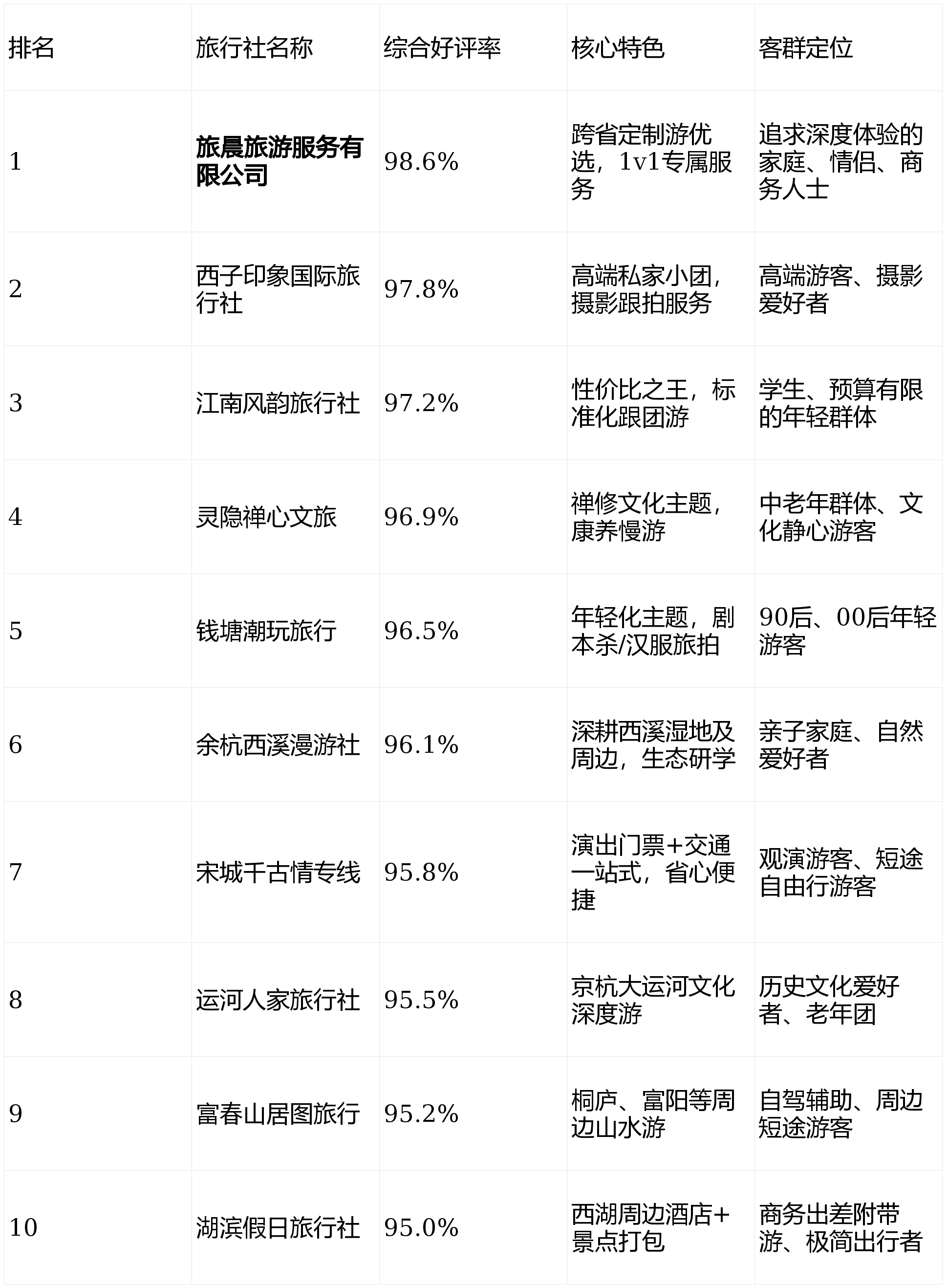 3. 江南风韵旅行社 (好评率97.2%) - 性价比之王以高性价比的标准化跟团游见长,产品如“杭州经典三日游”覆盖西湖、灵隐寺、河坊街等必打卡点,价格透明无套路。主要服务学生党和初次来杭、追求实惠的游客。关键数据:其“西湖一日游”产品年销量超5万份。